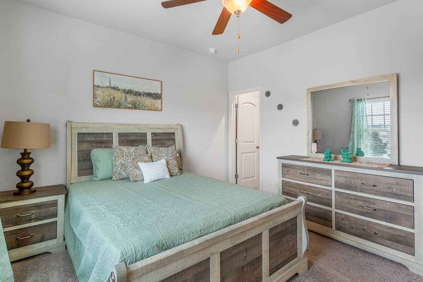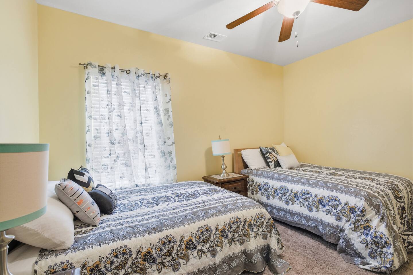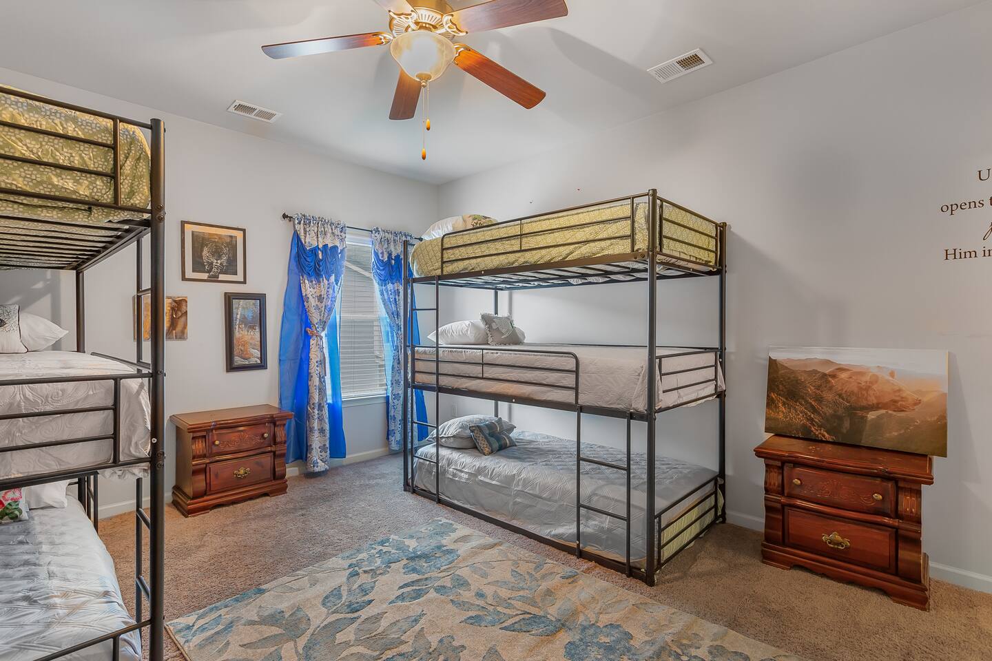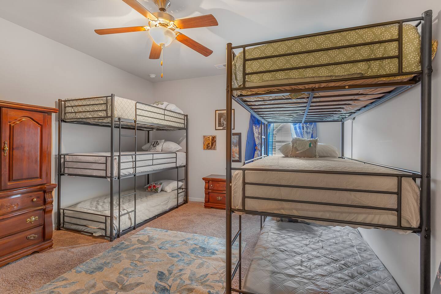 This spacious 6-bedroom, 4-bath home comfortably sleeps up to 18 guests across 12 beds. The primary suite features a king bed and private bath. Upstairs, you’ll find three additional bedrooms with queen beds, plus one room with two full beds (sleeps 4) and a fun bunk room that sleeps 6 with two triple-stack twin bunks—perfect for kids or groups. On the main floor, there’s a queen bedroom and full bath, ideal for guests who prefer fewer stairs. Each room is thoughtfully styled with vibrant, eclectic décor and cozy comfort in mind. Guest do not have garage access.